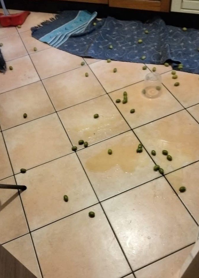 L’umana era appena tornata da fare la spesa e aveva lasciato sul tavolo della cucina un barattolo di olive, da cui aveva iniziato a piluccare. Ad un certo punto ignara del pericolo, si è allontanata lasciando quella meraviglia proprio lì a portata di zampa. Con un colpo da vero intenditore, ho infilato la zampa nella salamoia. Purtroppo, il barattolo è caduto e il pavimento della cucina si è trasformato in una pista scivolosa! L’umana avendo sentito il trambusto è arrivata in cucina ma io, maestro dell’improvvisazione, ho saputo trasformare il disastro in spettacolo: mi sono messo a rotolare nella salamoia come se fossi in un centro benessere per gatti!